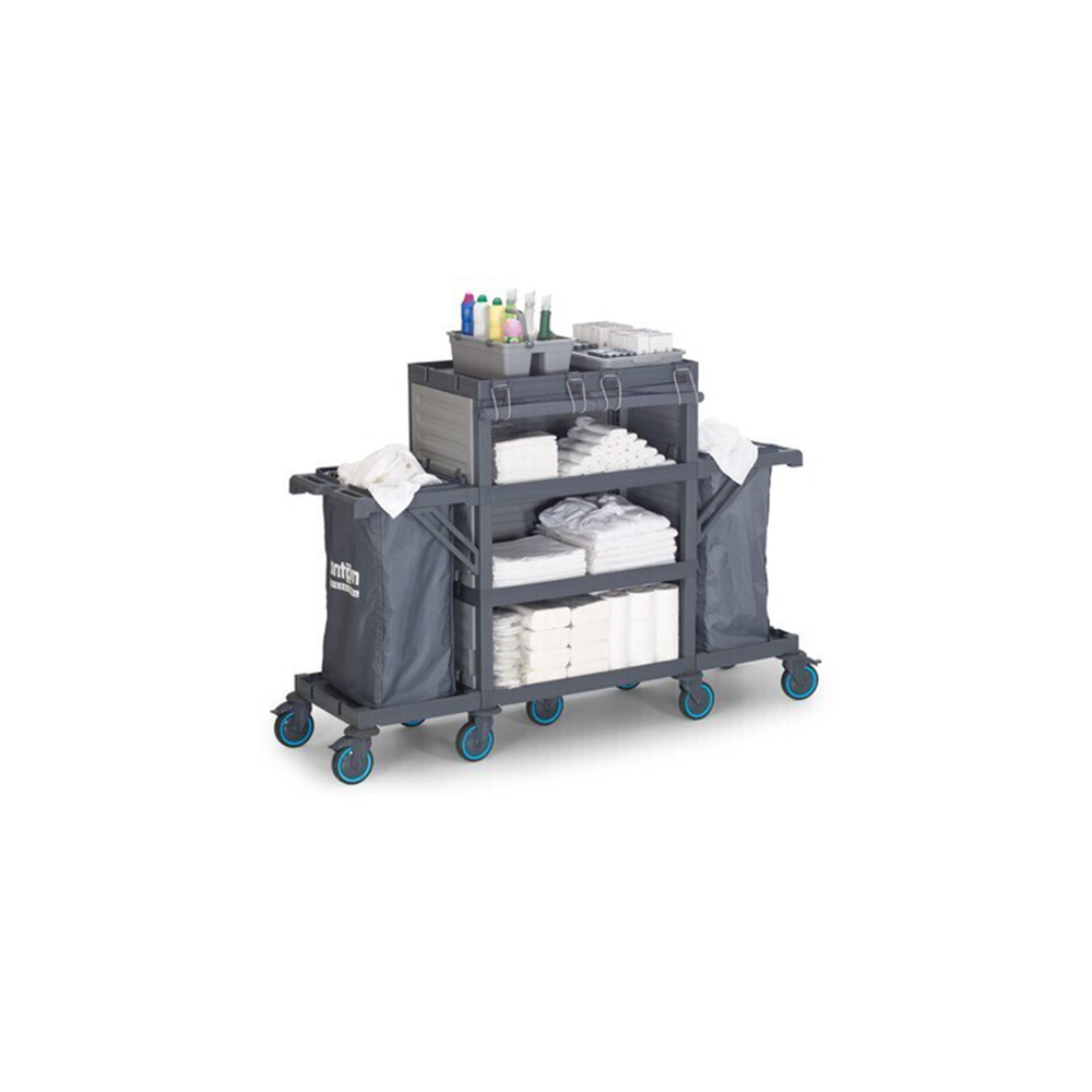 Fantom Procart 433 kat arabası, otel, tatil köyü, hastane, rezidans ve yurt gibi profesyonel işletmelerde temizlik ve oda servisi operasyonlarında maksimum verimlilik sunar. 6 mm kalınlığında CPP gövdesiyle dayanıklı bir yapıya sahip olan bu model, ergonomik tasarımı ve geniş depolama alanlarıyla günlük iş akışını kolaylaştırır. Frenli, sessiz ve tamponlu tekerlekleri sayesinde hem iç hem dış mekânlarda konforlu hareket imkânı sağlar.